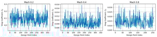 Since the aerodynamic coefficients were obtained from deterministic CFD simulations rather than stochastic experiments, classical statistical confidence intervals are not directly applicable. Instead, an equivalent uncertainty bound was estimated based on surrogate model prediction error. The 95% confidence bounds for the lift and drag coefficients were approximated using ±1.96 times the standard deviation of the surrogate prediction residuals evaluated at independent verification points. Based on this assessment, the resulting uncertainty in both and remained within ±3–5% of the corresponding mean values across all Mach numbers.