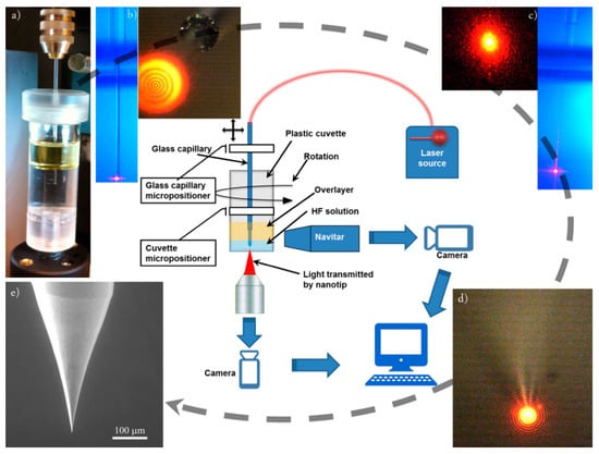 Wing method (WM) set-up scheme. In the centre of the figure, a sketch summarizes all the parts of the set-up. Laser light is coupled to the fibre in order to control the etching, monitored by a microscope coupled to a Charged Coupled Device (CCD) camera and elaborated by a specific home-made software. In panel (b,c), the lateral views are obtained by a NAVITAR lens zoom. Pictures represent the different steps of the “path” followed to fabricate a nanotip starting from an optical fibre. In (a), the vial containing the etching solution, the oil overlayer, and the fibre is shown. The vial is connected to a rotary motor in the bottom part, while the fibre is connected to another rotary motor. In (b), the lateral and bottom views of the fibre during the etching with the source laser on are shown. Panel (c) shows a subsequent phase of the etching process. In this case, the rod is very small, as it can be seen looking at the laser light leakages along the fibre. In (d), the nanotip is formed. In (e), the image taken with a scanning emission microscope (SEM) shows the small apex size of the tip as the final result of the fabrication method. HF, hydrogen fluoride.