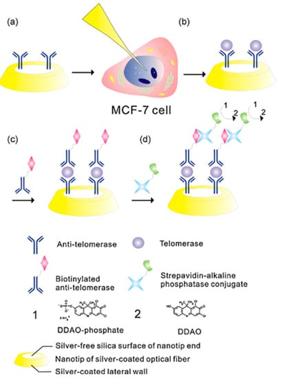 As in the previous papers, Zheng et al. used antibody-functionalised nanotips for intracellular analysis []. They applied a similar preparation of the fibre; that is, the tapered tip was covered by a thin layer of silver for preventing light leakage, leaving the aperture free for optical detection; then, the sensing surface was silanised and activated with glutaraldehyde for the antibody immobilisation. In this case, the antibodies were specific for telomerase, a general cancer biomarker, and the incubation in cell was performed for 30 min and in two different cell lines (MCF-7 breast cancer cell line and human mesenchymal stem cell line, as control). The reacted telomerase at the tip of the fibre was quantified via a sandwich immunoassay (Figure 3); the nanoprobe was incubated with a biotin-labeled anti-telomerase antibody and then with a strepavidin–alkaline phosphatase conjugate; in the end, DDAO-phosphate solution was added for fluorescence measurement.