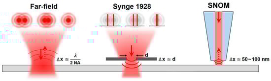 Working principle of a scanning near-field optical microscopy (SNOM) system with spatial resolution (Δx) for far-field optical microscope (on the left), Synge’s theoretical proposal (in the centre), and near-field scanning optical microscopy (on the right). Numerical aperture (NA) represents the numerical aperture of the microscope objective; d is the dimension of the aperture in the Synge’s proposal. Reproduced from [] under Creative Commons Attribution License.