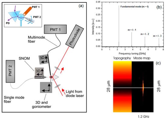 (a) A sketch of the improved measurement set-up with the SNOM system, based on the shear-force mechanism and fibre nanotip, for the topographical mapping of whispering gallery modes (WGMs) and the recording of their spectra by means of a multimode fibre. The inset shows the details of the coupling configuration; (b) the recorded spectrum of the WGMs for m ≤ l; (c) a particular of the topographical (on the left) and spatial (on the right) spectral mode map for the fundamental WGM. Reprinted with permission from [,]. PMT, photomultiplier; PD, photodiode.