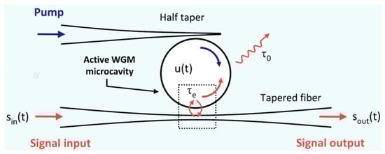 - Rasoloniaina, A.; Huet, V.; Nguyên, T.K.N.; Le Cren, E.; Mortier, M.; Michely, L.; Dumeige, Y.; Féron, P. Controling the coupling properties of active ultrahigh-Q WGM microcavities from undercoupling to selective amplification. Sci. Rep. 2014, 4, 1–8. [Google Scholar]