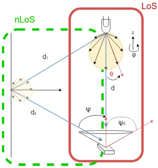 - Only the first reflection on the wall (if any) is considered for the non-line-of-sight (nLoS) component. The type of reflection considered is diffuse.