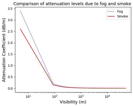 When the visibility is low, the attenuation due to fog is more potent than that of smoke. It is understandable given the equations. Indeed, the wavelength dependency of the attenuation stops under 500 m and reduces the fog attenuation (Equation (7)) to 3.91/ (m) compared to 3/ (m) for smoke (cf. Equation (13)). When the visibility increases, starting around 1 km, the graphs tend towards nearly the same value.