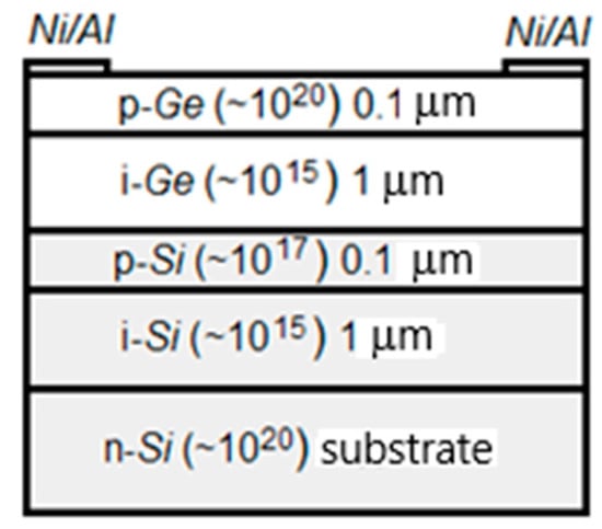 Ge-on-Si single-photon avalanche diode (SPAD) structure cross-section illustrating two Ge layers, two Si layers, Si substrate, Ni/Al contacts, doping number densities in cm−3 (in brackets) and layer thicknesses.
