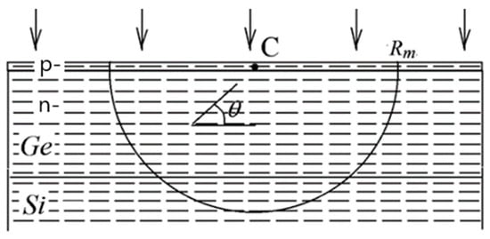 All these emitters are equidistant from some point, C, in the p-Ge layer (see Figure 4). An effective distance Rm in the body of the SPAD, from which a re-emitted radiation may have an essential magnitude at C, is of α−1. We then must account for the notion that the electric field of the incident radiation Ei drives the emitters in the plane parallel to the p-Ge layer. These emitters give rise to a re-emission of radiation with the electric field amplitude Ee dependent on θ (see Equations (4) and (5)). To account for this effect, we choose on the semi-sphere layer of a radius R a sub-volume δv = δsδR = R2δθδφδR, where δs is the cross-sectional area of the sub-volume. All emitters in such a volume will produce at C the fields of practically the same amplitude.