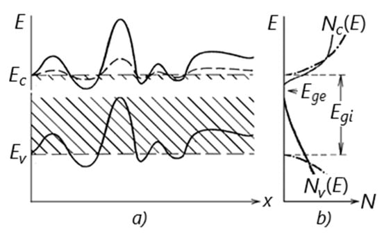 In such materials, the typical for intrinsic semiconductors’ sharp zone boundaries (dashed straight lines in Figure 5a) is blurred and the “tails” of the allowed occupation states penetrate the forbidden zone, resulting in a substantially narrower effective bandgap Ege. []. The physical reason for this effect is the local fluctuations of the internal electric field in a material due to a generic inhomogeneity of the spatial distribution of a dopant at its high concentration []. The local shift of zone boundaries, which is induced by such fluctuations, is illustrated in Figure 5a by the two solid lines and the dashed curved lines. A deformation of zone boundaries, which is schematically depicted by two parallel solid lines, is typical for the case when the effective masses of charge carriers at zone boundaries coincide []. The local bandgap in this case does not change. As shown in [], such a case takes place in p-Ge for indirect interband transitions. The radiation with λ = 1.31 µm (ħω0 ≅ 0.85 eV) falls in the range of direct transitions in Ge (Egd ≅ 0.85 eV). Since an effective mass of electrons at the center of the Brillouin zone is much less than that of holes, the amplitude of the conduction zone boundary deformation is essentially reduced [] (the dashed curve). The shaded areas represent the “tails”, which are a result of averaging the field fluctuations. Figure 5b illustrates, schematically, the averaged densities of the allowed occupation states Nc,v(E) for electrons (c) and holes (v) for intrinsic (dash-dotted lines) and for highly doped (solid lines) material, and the intrinsic Egi and effective bandgap Ege.