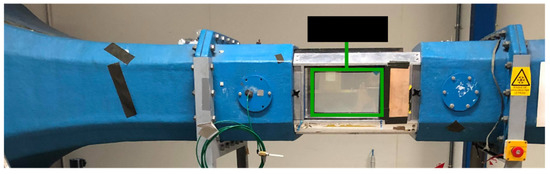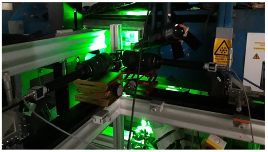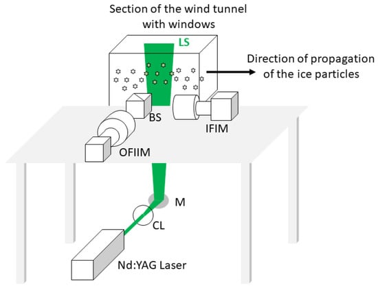 Experiments were performed using an icing wind tunnel. Water droplets were injected into the wind tunnel (the temperature of which can reach −30 °C) through a set of identical nozzles, and frozen. A laser sheet is injected into the narrow part of the tunnel where the speed of air is the highest. This part has optical windows of borosilicate glass, as illustrated in Figure 1. Nanosecond laser pulses are emitted by a frequency-doubled Nd:YAG laser and injected into the tunnel vertically, from the bottom. Interferometric particle imaging is performed using an imaging system that collects light scattered horizontally through a second transparent window on the side of the tunnel. The median light scattering angle is thus 90° in this configuration.