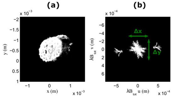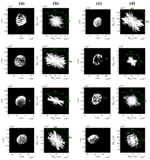 where I is the intensity of the out-of-focus pattern of the particle, G0 is the electric field scattered by the illuminated particle, λ is the wavelength of the laser and λBtot is the scaling factor between both functions which is deduced from the set-up. Experimentally, this correspondence between the two-dimensional autocorrelation of in-focus images with the corresponding two-dimensional Fourier transform (2DFT) of the IPI images has been validated in size and shape in many cases [13,14,15,27,28,29]. In the present study, we will use this formalism to estimate the dimensions of particles from the 2D-FT of the speckle images. To obtain the real dimension of the particles along x axis (resp. y), interferometric particle images will be 2D-Fourier transformed. After a binarization step, the size of the particle is then deduced from the size of the central spread spot (divided by a factor of two, as it can be assimilated to the 2D-autocorrelation of the initial envelope of the particle). The real particle’s size along the x axis will be noted δx. Similarly, it will be noted δy along y axis. We note that the coefficient Btot of the total optical transfer matrix of the IPI setup is about Btot = 0.0165 m in our experiment (from the particles to the CCD sensor). This coefficient Btot can vary slightly due to the thickness of the laser sheet.