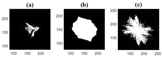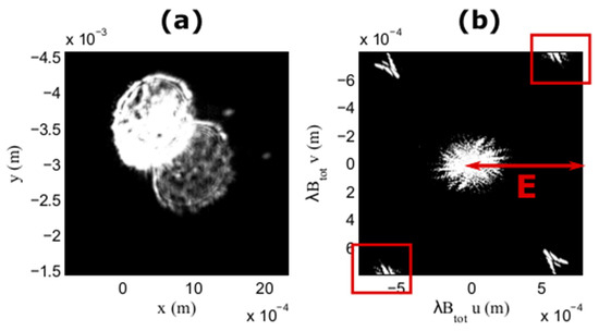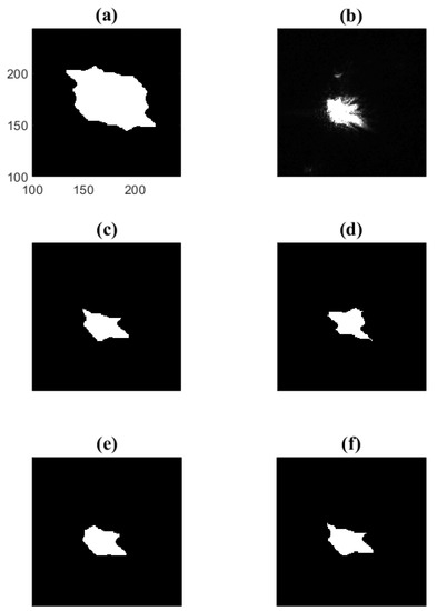 Assimilating the 2D-Fourier transform of the interferometric pattern to the 2D-autocorrelation of the contour of the particle (according to the simplified approach leading to relation (1)), it is possible to predict a family of particle shapes whose 2D-autocorrelations match the experimental results using a tri-intersection method [34,35,36]. Figure 5a shows the binarized 2D-Fourier transform of one of the interferometric patterns that was recorded. Figure 5c–f show four possible shapes deduced from the tri-intersection method, whose 2D-autocorrelations match approximately the contour plotted in Figure 5a. In our experimental set-up, an imaging line gives the simultaneous in-focus image using a 50/50 separator prism as in reference [16]. In this case, the in-focus image of the same particle has been recorded simultaneously and is shown in Figure 5b. It is relatively similar to the shape predicted in the case (e).