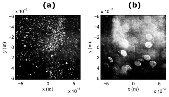 Figure 9. In-focus image of the measurement field when packets of nitrogen particles cross the measurement area (a), the out-of-focus image recorded simultaneously (b).