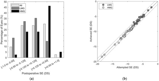 (a) Postoperative refraction distribution for all cases, in LMG and HMG groups. (b) Association between attempted and achieved SE. Continuous lines and dashed lines represent respectively the unitary relation and ±0.50 DS of difference between attempted and achieved SE.