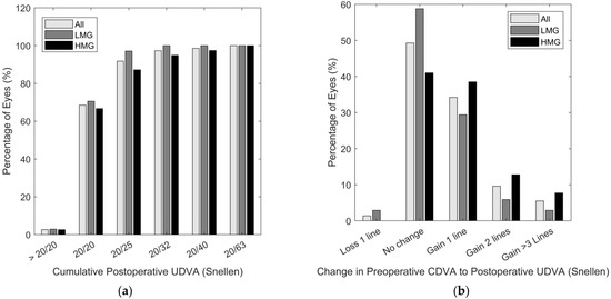 (a) Cumulative percentage of postoperative UCVA in logMAR. (b) Visual acuity variation from preoperative CDVA.