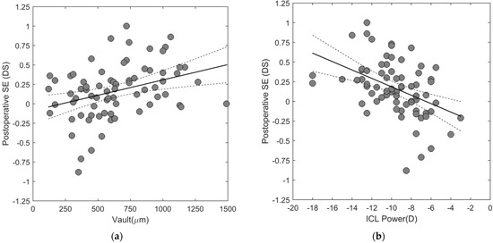 Association between the postoperative SE and (a) vault, and (b) ICL power. The continuous line represents the linear model fit to the data and the dashed lines represent the 95% confidence intervals limit. Postoperative SE = postoperative manifest SE - postoperative predicted SE.