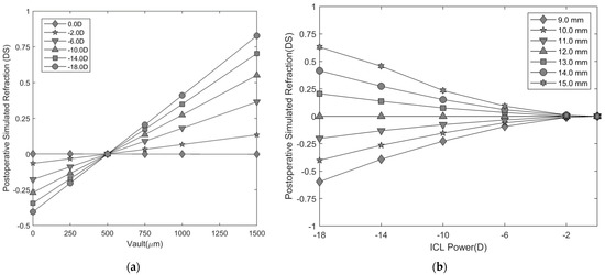 For an ICL calculated to a predetermined intraocular position (e.g., vault = 500 µm) any variation from this position produces a change in the postoperative simulated refraction, with a magnitude of variation depending on the ICL power (Figure 5a). For the optimal vault range, i.e., vault > 250 and < 750 µm, the postoperative simulated refraction ranges from ±0.03 DS for a −2.00 DS ICL to ±0.20 DS when a −18.00 DS ICL is used. The variation in the postoperative simulated refraction per 100 µm of vault shift is 0.04 DS for a −6.0 DS, 0.06 DS for a −10.0 DS, and 0.08 DS for a −18.0 DS ICL.