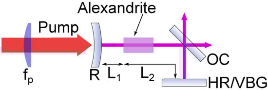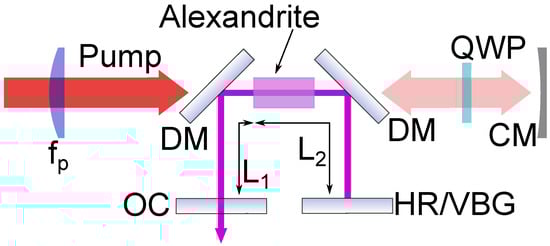 A four-mirror cavity was formed of: two dichroic mirrors (DM) that were highly transmissive (HT) at the pump wavelength and highly reflective at the laser wavelength ( = 700–820 nm) at 45; a mirror that was highly reflective at the laser wavelength at 0 (HR); and an output coupler (OC) with reflectivity . The HR mirror was later replaced by the volume Bragg grating (VBG). The cavity lengths = 35 mm and = 40 mm were set to provide a laser mode size of ∼200 m at the crystal for around 20 W of pumping based on the thermal lens modelling [13].