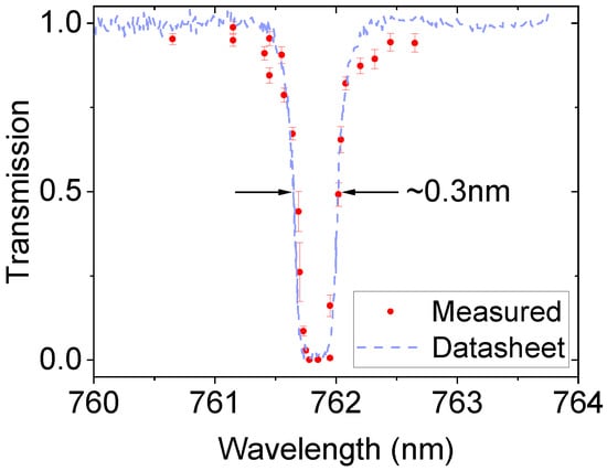 For wavelength selection and narrow-linewidth operation, the HR mirror was replaced by a volume Bragg grating (VBG). The VBG (Optigrate) had dimensions of 2 × 2 × 3.6 mm and a >98% diffraction efficiency. The transmission of the VBG was measured using an in-house built narrow-linewidth Alexandrite laser (details of which can be found in [14]) with the results shown in Figure 2 and compared to the VBG data-sheet. The experiment confirmed the central wavelength to be 761.8 nm with a FWHM of around 0.3 nm. The grating reflectivity was measured to be >99% and it was decided to be used as an HR mirror.