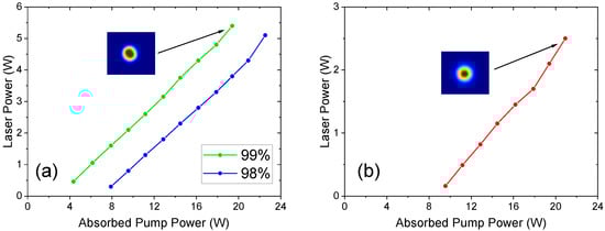 Figure 7a shows the laser power (total output from OC) as a function of the absorbed pump power for the convex-plane cavity without spectral control. Three OCs were tested: , and with the highest power achieved with the latter. A maximum power of 5.2 W was achieved at an absorbed pump power of 15.7 W (33.1% optical efficiency) with a slope efficiency of 50.5% and threshold of 4.8 W. The beam quality was measured to be in both directions - demonstrating the improved performance of this cavity when power-scaling.
