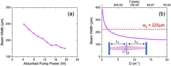(a) Experimental TEM00 beam width radius (based on measured beam width and corrected using value) as a function of the absorbed pump power for the plane-plane cavity. (b) Theoretical calculation of TEM00 beam width radius at the thermal lens as a function of its dioptric power with = 35 mm, = 40 mm and = 760 nm.