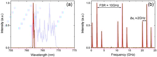 (a) Laser spectrum with (red) and without (blue) VBG. (b) Scanning Fabry–Perot interferometer demonstrating three longitudinal modes.