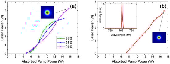 Figure 4a shows the laser power as a function of the absorbed pump power for the four-mirror plane-plane cavity without spectral control using the HR mirror. Two OCs were tested: and . Optimal results were obtained with the former with a maximum laser power of 5.4 W at an absorbed pump power of 19.4 W (27.8% optical efficiency) with a slope efficiency of 32.5% and threshold of 3 W. The beam quality was measured to be , (beam shown in inset of Figure 4a).