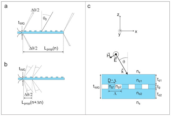 A visualization of the sensitivity of the propagation length with respect to refractive index changes is shown in Figure 1a,b. Light propagates through a waveguide grating mode in the positive x-direction. Due to the interaction with the grating, light is emitted into free space with a propagation length under a mean angle and with an angular divergence of . Without a change in the refractive index, the propagation length is large, and is small. When a refractive index change is introduced, the propagation length is much shorter, and is larger. Detailed equations on these relations are provided later in this text.