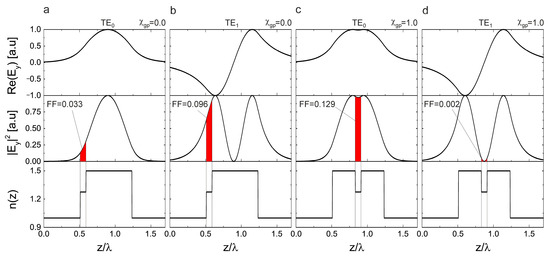 To introduce some measures of interest and explain the role of the mode, as well as the role of symmetry, we defined a waveguide grating with the parameters , , , (), and , and compared the cases of (Figure 2a,b) and (Figure 2c,d). As it is known from the literature, such a waveguide grating exhibits eigenmodes () that can be found for distinct real-valued lateral momenta , whereby is the effective refractive index of an eigenmode. The index counts the number of nodes of the electric field distribution attributed to an eigenmode. Thus, the has no nodes of , while the mode exhibits exactly one node of . This node causes an interesting behavior of the filling factor of the grating layer