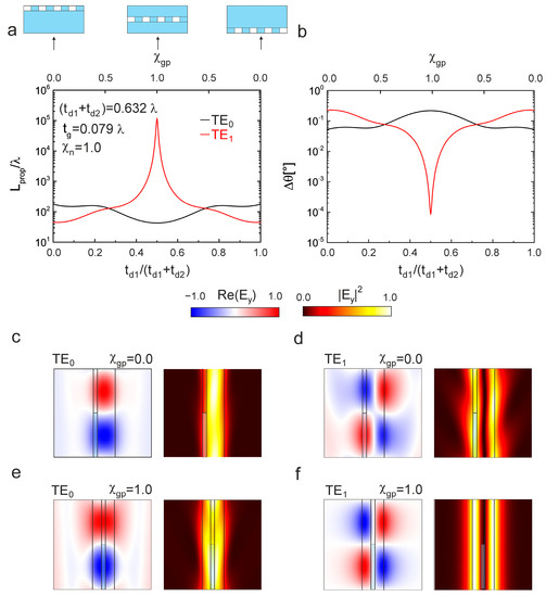 For an asymmetric geometry (), shows a maximum of around at a distinct value of (Figure 5b) for the mode. This maximum occurs since the position of the node of shifts through the waveguide grating with respect to the z-direction as a function of , and the largest value of is observed when is minimized.