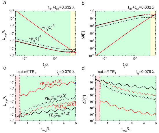 Figure 4c,d show and with variation in at a fixed value of . is strongly increased for the mode at in comparison to all other displayed cases for all values of above the cutoff of the mode.