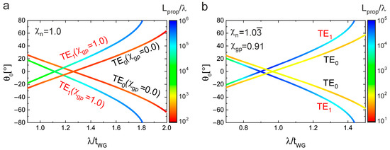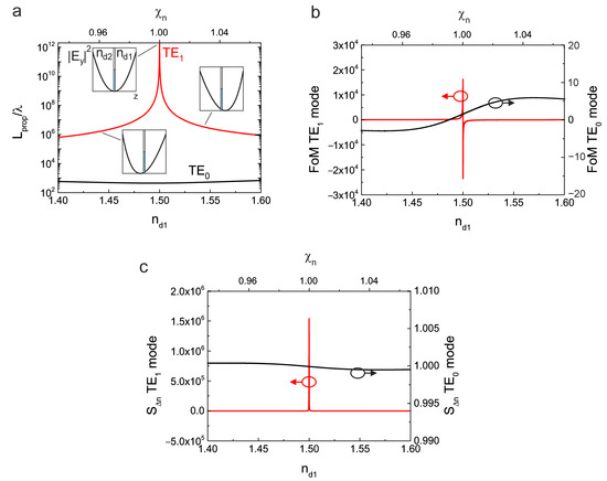 (a) The dispersion relations and normalized propagation lengths of the TE0 mode for and the TE1 mode for under fixed ratios of all geometry parameters as used in Figure 3 (only the wavelength is varied with respect to the geometry) and ; (b) dispersion relations and normalized propagation lengths for an asymmetric geometry with , for both the mode and mode with .