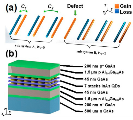 (a) Schematic of the proposed non-Hermitian SSH dimer chain, with staggered gain (orange) and loss (blue) waveguides, except the center single defected gain waveguide. and represent the coupling coefficients for intradimer and interdimer, respectively, where > . (b) Heterostructures of the InAs QD lasers grown by molecular beam epitaxy.