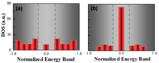 where k is the Bloch wavenumber within the first BZ and the winding number corresponds to the Zak phase (ψZAK) divided by π [38]. It has been shown that when Wh = 0, the system exhibits a trivial topological phase; in contrast, if Wh = 1, the system transits into a nontrivial topological phase [39]. In the explored topological configuration, as shown in Figure 1a, all sites in the left side of the center site could be treated as subsystem A, which had a winding number of 0, and the rest of the sites, including the center site and all the other sites on the right side of the center site, could be treated as subsystem B, which had a winding number of 1 due to the different bounded edge with the coupling coefficient C1 in the left and C2 in the right. To obtain the coupling coefficients and , the mode coupling between the waveguides was studied by the commercial software COMSOL. = 10.05 cm−1 and = 5.32 cm−1 were obtained from COMSOL simulations. A topological transition would occur from configuration A to B, where the winding number changed from 0 to 1; as a result, the defect waveguide, the fourth pair dimer with a gain waveguide only, was located at the interface. Therefore, there had to be a topological interface state residing at the zero energy band, located at the defect waveguide. Szameit et al. already investigated such a topological waveguide configuration containing passive components, and showed the topological mode appearing in the center defect while preserving the PT symmetry [40,41,42]. In this work, we employed the dimer chain containing a gain and loss and an active gain defect to achieve a topological laser. In this context, a modified non-Hermitian SSH model was employed to study the density of state (DOS) of the SSH laser chain. The DOS was calculated by evaluating the number of eigenstates at the corresponding eigenvalues in momentum space (see Supplementary Materials for details). As shown in Figure 2a, the DOS was calculated with a passive defect in the center and all modes were grouped into two sets and separated by the middle gap. Different from defect-less SSH chains, topologically induced states manifested in the middle of the gap, which resulted from the PT symmetry breaking in the system. By introducing a gain into the center defect, as shown in Figure 2b, topologically induced states in the midgap were amplified, while states in the upper and lower groups were suppressed. It is worth noting that the DOS enhancement could be obtained not only by introducing the active defect, but also by introducing an absorptive lossy defect as well due to the time symmetry of the Hamiltonian.