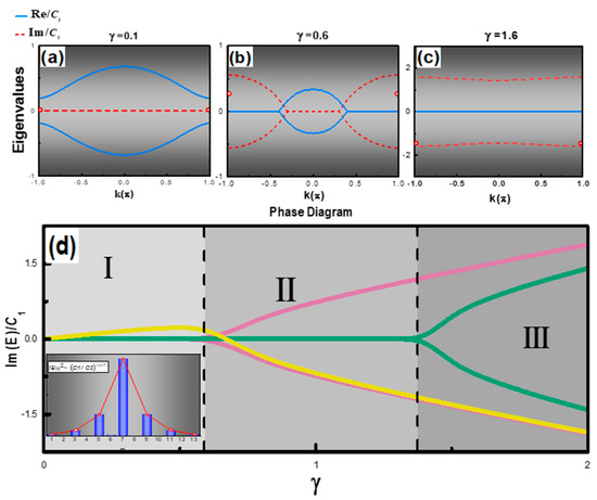 For characterizing trivial states and the topological state at different biasing levels, complex dispersion relations and eigenvalues of the SSH laser chain were analyzed. Three phases were employed to distinct degeneracy conditions of the eigenstates of the Hamiltonian. The explicit form of the Hamiltonian of the SSH chain was given in supplement, g represented the gain and loss in the SSH chain, and a was the scale factor of the gain in the defect site. In the case of this work, the scale a was set to one to provide a uniform gain across the SSH chain. A numerical calculation was carried out with g varying from 0 to approximately 20 cm−1. Figure 3 shows the eigenvalues and corresponding dispersion relation at different γ = g/C1, a dimensionless variable, where g was the gain applied to the FP waveguides. It was found that the topological zero-mode exhibited complex eigenvalues with any nonzero gain, as shown in the red circles in Figure 3a–c. As shown in the phase diagram in Figure 3d, in phase I, only the zero mode, represented by the yellow curve, exhibited a complex eigenvalue with a gain, and the SSH laser chain lased at the single topological mode. At a small value of γ = 0.1, the optical field was predominately located in the defect gain waveguide in the SSH system, as shown in the Figure 3d inset. The topological mode profile presented the exponential localization on the odd site n, where the wavefunction for odd n, and for even n. This was in agreement with the analytical solutions without a gain/loss on the SSH chain. With the increase in γ, other bulk modes showed complex eigenvalues, as shown in Figure 3b,c. In phase II, two bulk modes, represented by the pink curve, were bifurcated with complex conjugate eigenvalues, which suggested the bulk modes may have started to lase alongside the topological mode. With a further increase in γ, more bulk modes showed complex eigenvalues and the corresponding gain of these bulk modes was comparable with the topological mode. The green curve, in phase III, was one representative mode of those modes. The bifurcation of bulk modes resulted from the spontaneously PT symmetry breaking once the gain applied to the waveguide was nonzero. It is worthwhile to notice that, different from bulk modes, which only presented complex eigenvalues with a certain transition point γ > 0.6, the nontrivial topological zero mode would maintain complex eigenvalues with nonzero γ, as shown by the yellow curve.