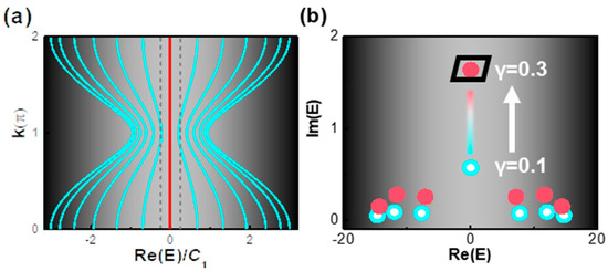 To further investigate the difference between nontrivial zero modes and trivial modes, a complex band diagram in a complex system was calculated. Figure 4a plots the band diagram of the topological system with neither a gain nor a loss. A bandgap was present in the center (between the grey dashed lines), and the topologically protected midgap states (red) sat in the center of the bandgap. Figure 4b shows the dynamic evolution of complex eigenvalues with the γ varying from 0.1 (blue dots) to 0.3 (red dots). With the same bias level, the topological zero states presented a higher gain than other bulk states. As the bias level of the whole system increased evenly, the increment of the topological mode was ~10-times of the ones of trivial modes.