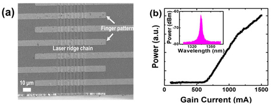 Top-view SEM image (a) and light–current (L–I) characteristic (b) of the SSH laser chain. It was observed that the lasing threshold current was ~600 mA. Inset: electroluminescence (EL) spectrum of the laser chain. The lasing wavelength was at 1.33 µm.