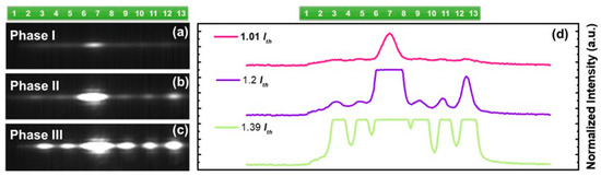 The near-field pattern of the SSH laser chain was measured to investigate the dynamics of the topological mode lasing and mode selections. As shown in Figure 6a–c, the near-field patterns from the laser chain were measured at various gain bias currents. Figure 6d shows the intensity line scans of the near-field images. The intensity saturation was due to the limited dynamic range of the near-infrared (NIR) camera. When the gain bias current was small, 630 mA, the SSH laser chain only lased at the topological mode in the center defect and the mode profile exhibited the maximum intensity at the center defect. When the bias current was increased to 700 mA, the first trivial bulk mode obtained enough gain and transits to the lasing mode, while the topological mode was still dominating in the near-field profile. The SSH laser system evolved to phase II. With a further increment of the bias current to 770 mA, more trivial bulk modes started to obtain enough gain and, eventually, transformed to lasing modes (see Supplementary Materials), which led to a more uniform near-field profile across the laser chain, and the system transited into phase III. The experimental observation showed clear phase transitions of the topological mode laser and agreed well with the theoretical predictions, as shown in Figure 3d. The mode evolution ceased in phase III due to the gain clamping, whereas the output power increased with the increased injection current, as shown in L–I (Figure 5b). It is worth discussing here, that unlike an oddly localized mode profile on the odd site with a small gain in phase I, there were even sites in the order of sixth, fourth, and second, presenting a mode distribution with a larger gain. This was the result of the PT symmetry breaking of bulk modes, and the coupling between nearby sites with the same gains of a sixth and seventh defect waveguide would also suppress the single-mode laser performance. From that perspective, in future work, it is tentative to apply electrical pumping with space symmetry, which adds gain on odd sites and loss on even sites. In that case, the optical mode would maintain localization on odd sites while the gain increased.