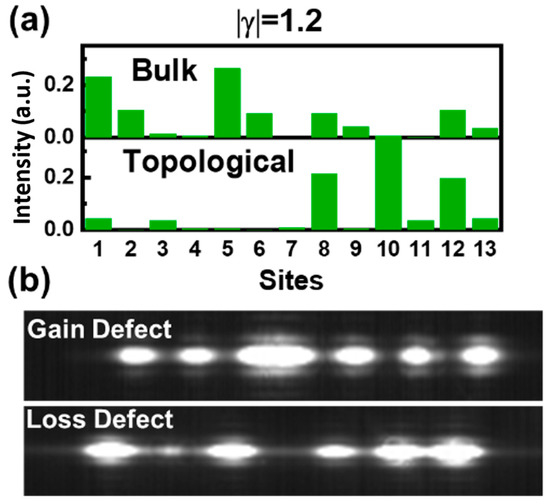 (a) The optical field intensity distribution of bulk mode and topological mode in configuration with lossy defect, where normalized lossy value was given as |γ| = g/C1 = 1.2; (b) near-field characteristics of the gain and lossy defected topological lasers.