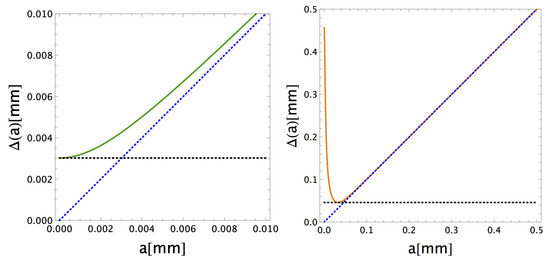 In Figure 2, we represent a graphical identification of , both in the case of (specifically, ), in which the spread is constant, and in the case (specifically, ), in which decreases with a, thus providing an even more reliable proportionality between image and object widths. In all plots, the parameters are fixed to , , , and .