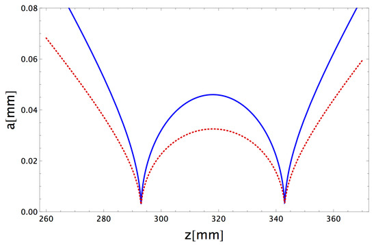 In Figure 3, we report a graphical identification of , both in the case (specifically, ), in which is monotonic with respect to a, and in the case (specifically, ), in which the minimum occurs for a finite value , and the image width increases with decreasing object width for .