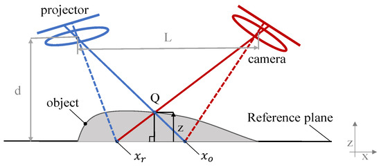 The principle of PMP, as shown in Figure 1, is to project standard grating fringes onto the measured object for spatial phase modulation, and then capture five deformed grating fringe patterns with a camera. The distance between the digital light-processing (DLP) pupil center and the camera pupil center is defined as L. The distance between the center of the DLP pupil and the reference plane is d. Due to the height of the inspection point Q, the fringe is deformed from the point to point; thus, is the displacement of the stripe in world coordinates (X–Y). Geometrically, the height of the measuring point z relative to the reference point can be expressed as the geometry of the digital fringe projection (DFP) experimental device and as a function of the scalars and , as shown in Figure 1 [27].