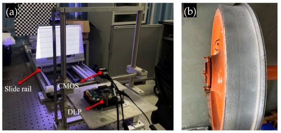 To verify the performance of the new method, an experimental setup was developed (Figure 2), which mainly included a DLP projector (Light-Crafter 4500) with 912 × 1140 resolution and a complementary metal–oxide–semiconductor (CMOS) industrial black-and-white camera (Basler acA1920-40 gm) with 1920 × 1200 resolution and a 8 mm focal length lens. Moreover, the system also included a slide rail (MGW12H4R1200ZFCM) with an accuracy of 0.03 mm and a computer for calculation and control.