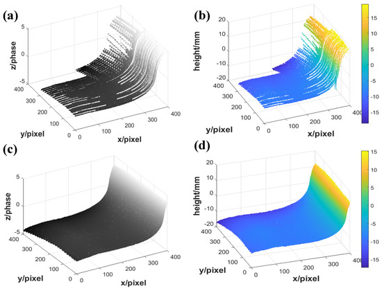 The unwrapped phase can be used for 3D reconstruction once the system is calibrated. The height information of the measurement object h () can be reconstructed by the mapping algorithm [28,29].