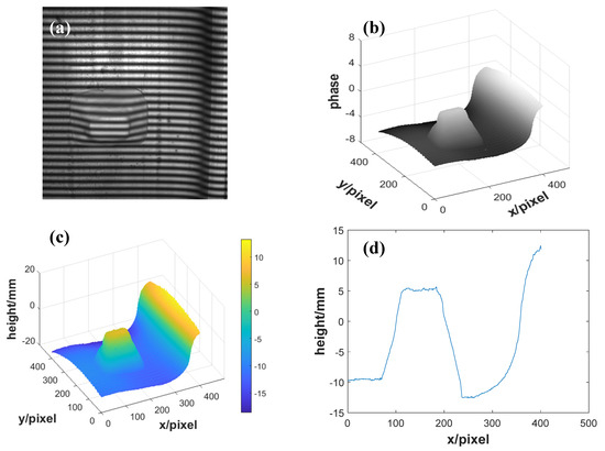 Furthermore, in order to verify the ability of this method to detect intrusions on the wheel tread, we placed a block on the wheel tread and measured it. Figure 6a–d show the acquired deformed fringe pattern, the retrieved unwrapped phase using the improved Stoilov algorithm, the 3D reconstruction of the wheel tread attached with a block, and the height data of column 256 in Figure 6c, respectively. According to the experimental results, the improved Stoilov algorithm had a better performance in the reconstruction, and its repeatable accuracy could be guaranteed; hence, this method can be used to detect intrusions on the wheel tread.