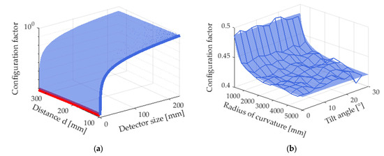 The other case is the configuration factor changes with the radius of curvature and tilt angle. In the optical layout, r2 = 2.5 mm, d = 118 mm R ranges 330 mm to 5000 mm, from 0° to 30°. The results are shown in Figure 5b where the grid is for the calculated results and the blue curve is for the analytical results. Full analytical expressions can be found in Appendix A. The figure shows that as R increasing, the spherical cap becomes close to a disc and the result for this case fulfills the following well-known relation: