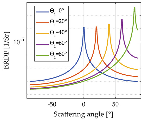In Equation (16), BRDFi is a function of wavelength, incident angle and scattering angle . Since the incident gaussian beam is along Z-axis and the considered scattering is backward, the scattering angle is minus and hence the angle of incidence and the scattering angle fulfill: