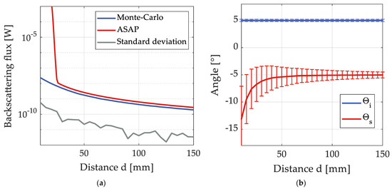 The calculated backscattering flux changes with distance d is shown in Figure 7a where the mirror has tilt angle of 5°. For Monte-Carlo estimation, 10,000 random pairs of patches are chosen and the backscattered flux is plotted the blue curve and the gray curve is the corresponding standard deviation. The results are in good agreement with ASAP calculation (Figure 7a red curve) for large distance. The backscattering flux of Monte-Carlo methods at d = 118 mm is whereas the ASAP result is . The flux increases dramatically as the distance decreases which is because the detector goes into the specular reflected paths which can be seen in Figure 4. On the other hand, for small distance, a larger variance can be witnessed which can be explained by the geometrical effects. As mentioned, BRDF is a strong function of angle of incidence and scattering angle. When the distance is small, the normal vectors of the spherical cap different positions are different meaning that the local patches scatter the incident beam differently. However, as the distance increases and when the area of the spherical cap is much smaller than the distance, the geometrical shape of the scattering source has little effect on scattering. This assumption is commonly used in remote sensing. In some literature, the geometrical effect is simplified to the solid angle when d is much larger than the size of scattering source. Figure 7b shows the evolvement of the average of incidence angle and the scattering angle from small distance to large distance. The error bars represent the standard deviation of the incident and scattering angles at different positions. For the considered case, the angle of incidence (Blue curve in Figure 7b) is near a constant of 5° which corresponds to the tilt angle of the spherical cap. The scattering angle (Red curve in Figure 7b) are minus meaning the backward scattering and both the average and the variance for small distance are larger than that of larger distance.