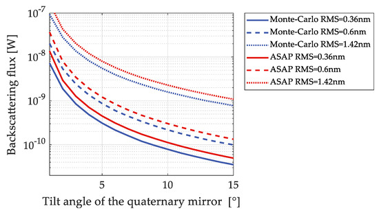 In this section, a superpolished spherical cap is considered. Compared with the diffuse sample, the most obvious difference is that the scattering is directional. On the other hand, in practice the profile of the incidence irradiance is also not necessary to be uniform. Therefore, the radiance term in Equation (5) has to be kept in the integral and a quite different conclusion can be drawn. This section deals with such a case and in order to calculate the backscattering of the quaternary mirror of Taiji GW telescope. For simplicity, the total power of the incident gaussian beam is set to be unit which is easy to calculate the fraction . The diameter of the mirror is 8 mm and the diameter of the collector is 5 mm. The scattering distributions of the mirror are simulated with Harvey model. Figure 6 is the illustration of BRDF under different angle of incidence where b = 0.001, s = −2. With the considered configuration, TIS is 17.9 ppm which corresponds to . In practice, these parameters should be modified according to the real measured data. Then, the flux of the backscattered light can be calculated as a function of scattering distribution, tilt angle and radius. The calculated results are compared with commercial soft ASAP [30] which is famous for the outstanding capability, flexibility, speed and accuracy. The scattering calculation of ASAP is based on ray tracing which additionally generates a set of scattering direction cosines in the importance edges and the energy is not always conserved [31].