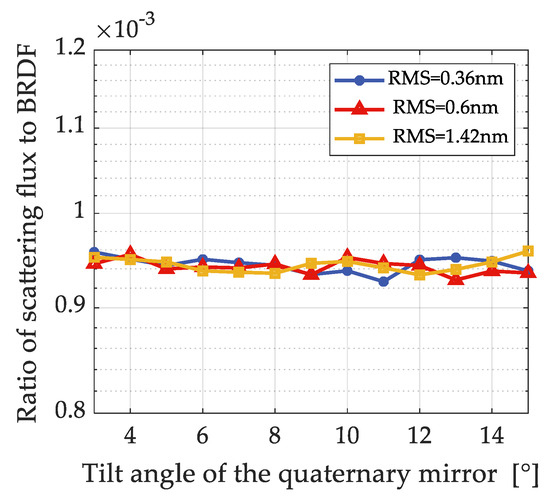 On the other hand, it is also found that when the optical layout fulfills Equation (22), the standard deviation of the incident angle and the scattering angle are small meaning that the ratio of backscattered flux to BRDF is around a constant which equals to: