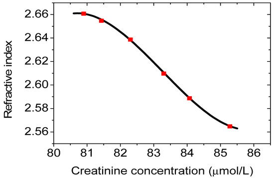 A photonic crystal having the structure (Si/TiN/SiO2)N/defect (Si/TiN/SiO2)N is applied as a creatinine sensor. The refractive indices of the layers are 3.3 (for Si), 1.28 (for TiN), and 1.46 (for SiO2). It is worth mentioning that TiN demonstrates some crucial assets such as amazing thermal stability, soft optical loss, and chemical inertness. Owing to its high thermal stability and high field improvements, a TiN-based photonic structure can be the appropriate candidate for optical sensing devices with high performance [24]. In general, ternary PC is chosen because it is more sensitive compared to binary PCs [25]. Therefore, we can use another layer other than titanium dioxide with similar properties to install a ternary photonic crystal. The thicknesses are selected as h1 = 120 nm, h2 = 260 nm, and h3 = 190 nm. The assumed number of periods is N = 4. D is the cavity layer to be treated as a blood sample with different concentrations of creatinine. In Table 1, the refractive indices for various concentrations in µmol/L of creatinine in a blood sample is given [26,27] and is shown in Figure 2 (red points). Using a mathematic program, the index-concentration relation’s polynomial fit is provided by