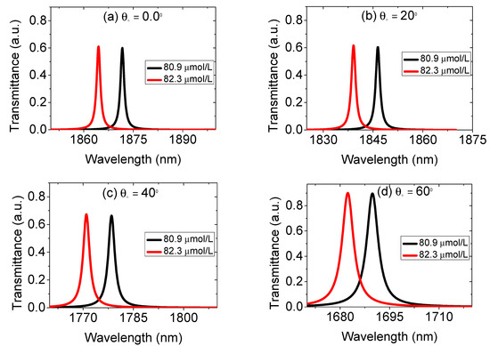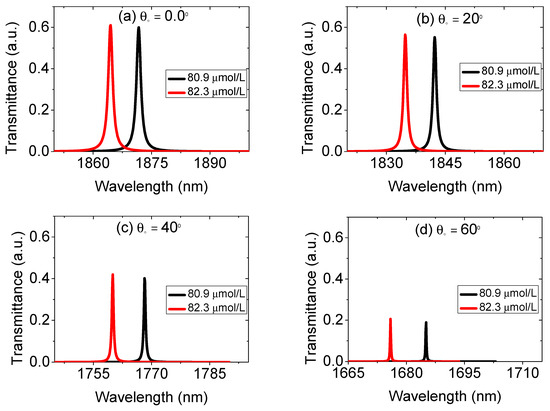 In this section, the transmittance spectra was investigated for both TE and TM waves when the cavity layer thickness was fixed as hf = 500 nm and the angle of incidence was adjusted in 10-degree steps from 0° to 70°. The spectrum of transmission is exhibited in Figure 4a–d (TE polarization) and Figure 5a–d (TM polarization) corresponding to incident angles 0°, 20°, 40°, and 60°, respectively. The transmission spectra of Figure 4 and Figure 5 show the reaction as the cavity region in the proposed structure was infiltrated separately with blood samples for two concentrations of creatinine (80.9 µmol/L and 82.3 µmol/L). With an increase in creatinine concentration, the defect mode shifts toward a lower wavelength. Because blood samples’ refractive indices drop as their creatinine concentrations rise, the defect peaks within the transmittance spectra shift in response. Moreover, the increase in the incidence angle at the same concentration of creatinine causes movement of the defect peaks toward the lower wavelength region with reduction in their intensity, as observed in Figure 4a–d (TE polarization), and with growth in their intensity, as seen in Figure 5a–d (TM polarization). The blue shift of the defect mode with an increasing of incident angle can be explained based on Bragg Snell’s law [29]:
